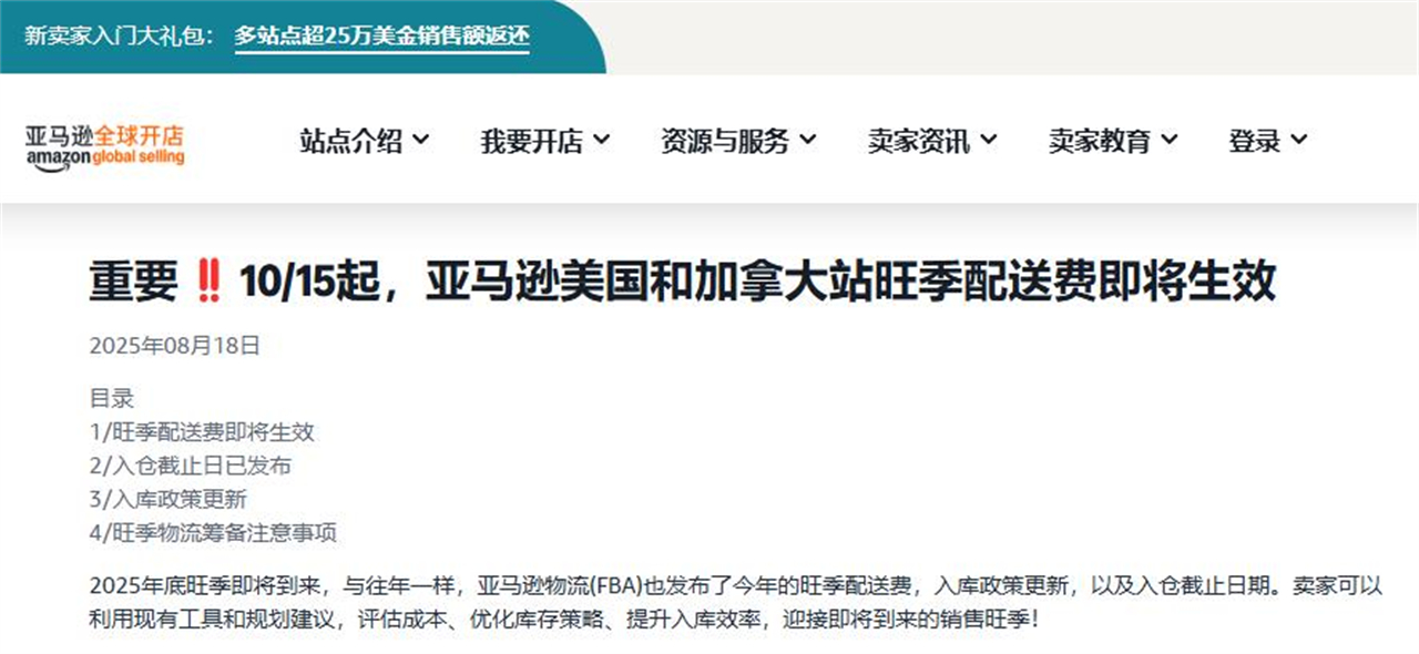 导读:近日,亚马逊全球开店发布公告,表示2025年10月15日至2026年1月14日,亚马逊美国站将征收旺季配送费。