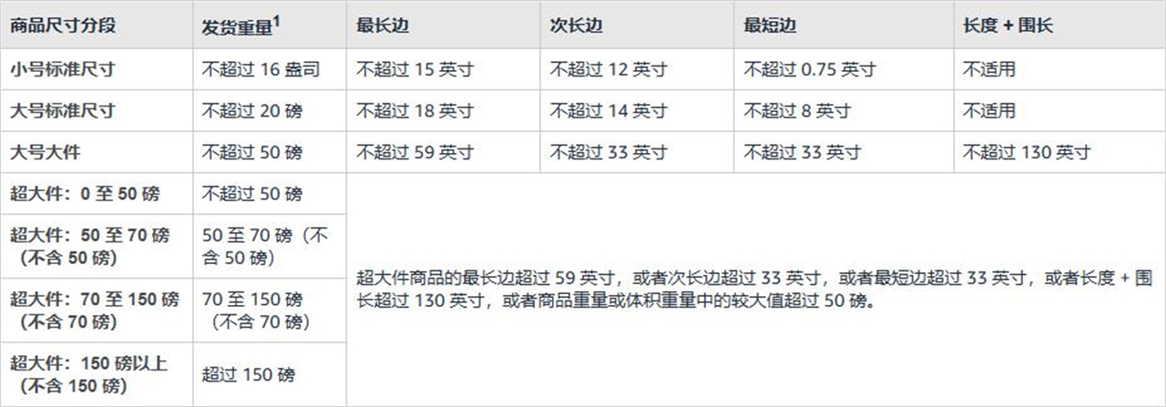 注:对于小号标准尺寸商品和150磅以上超大件商品,在计算运费的时候,发货重量为商品重量。除此之外,所有其他尺寸分段的商品,在计算运费的时候,均采用商品重量与体积重量二者中的较大值为计费重,其中体积重量等于商品体积(长 x 宽 x 高)除以139。每个尺寸分段的详细定义如下图所示: