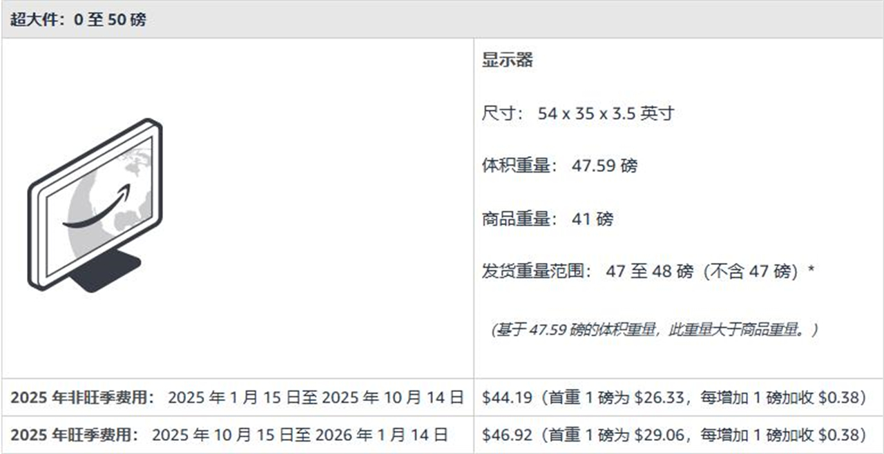 以一个尺寸为54 x 35 x 3.5英寸,商品重量为41磅的显示器为例,计算得出该显示器的体积重量为47.59磅(由54 x 35 x 3.5除以139计算得出)。对照图二商品尺寸分段的详细定义,因为该显示器在0-50磅,且次长边已经超过33英寸(35英寸),所以该显示器的尺寸分段会落在超大件(0至50磅)的分区里。然后,再根据图一超大件:0至50磅的尺寸分段细则,计算该显示器的旺季附加费,那就是首重29.06美金 + 超出首磅(1磅)的部分每磅加收0.38美金,即29.06 + ( 48-1 ) x 0.38 = 46.92(美金),也就是说,该显示器的亚马逊旺季配送费为46.92美金。