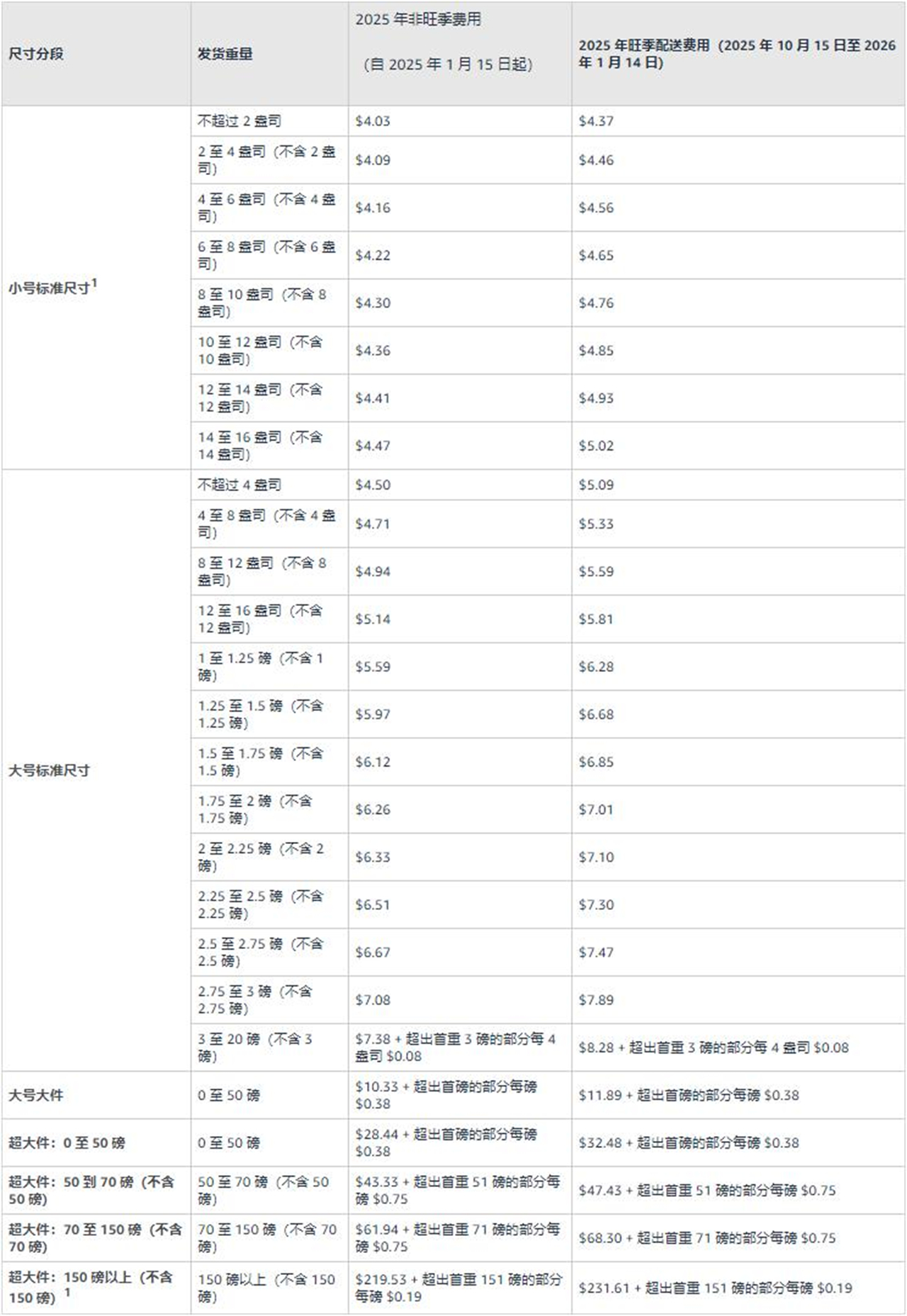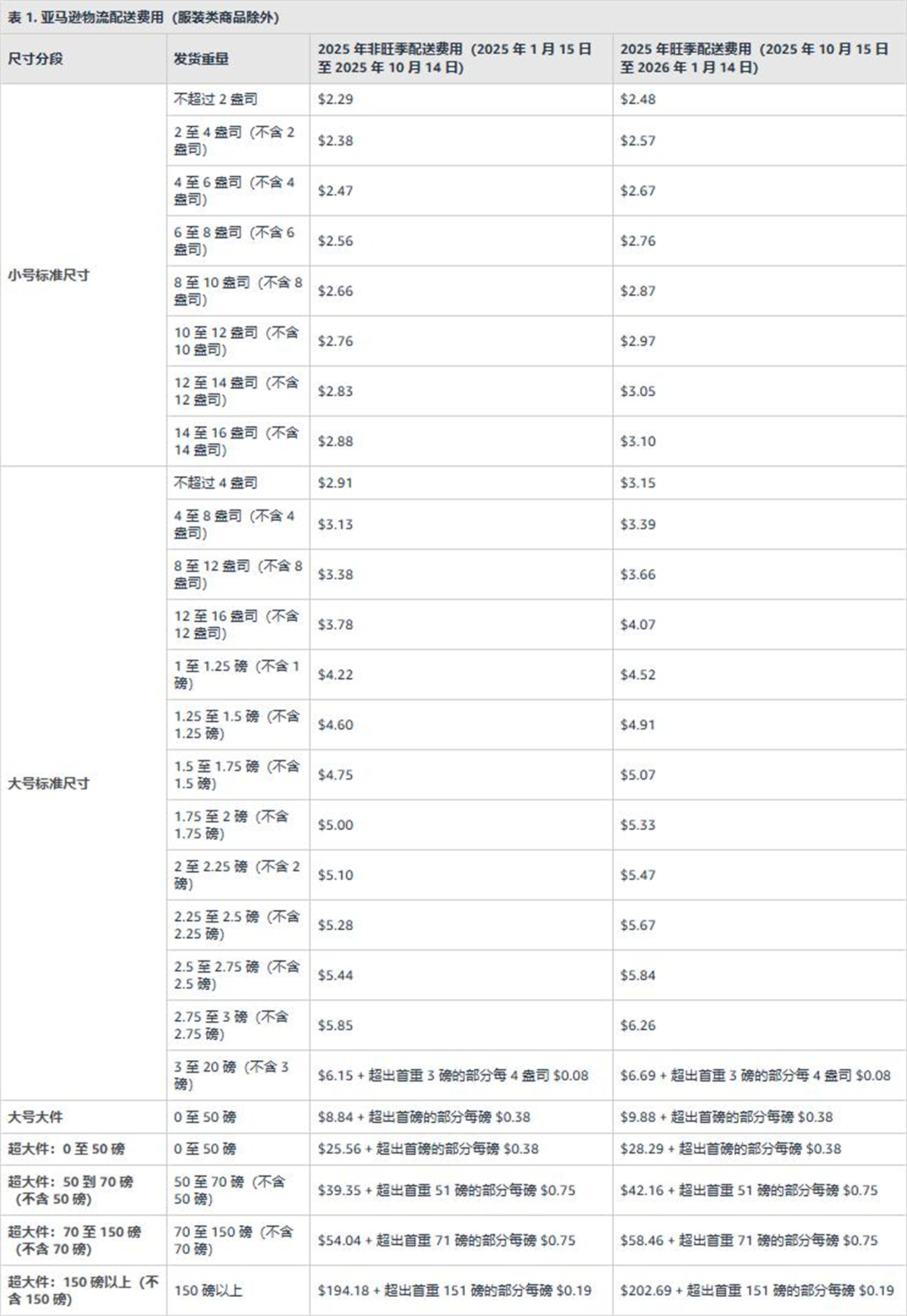 3.1 针对亚马逊物流商品(服装除外)的假日旺季配送费用如下图所示: