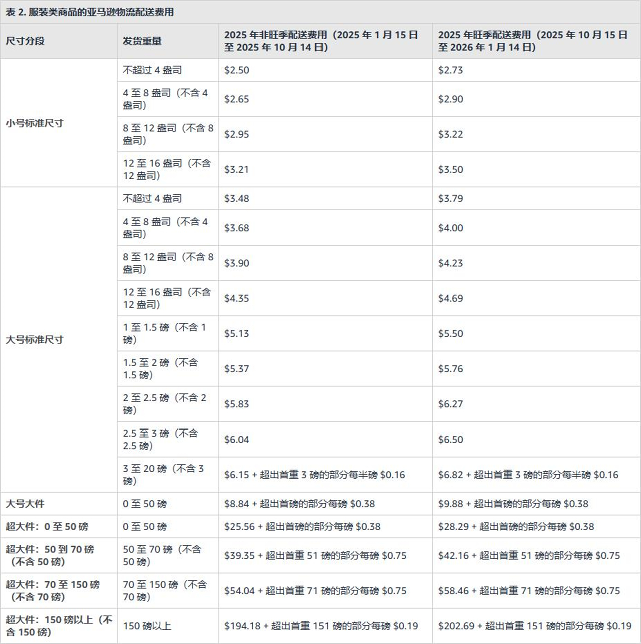 3.2 针对服装类商品,亚马逊的假日旺季配送费用如下图所示: