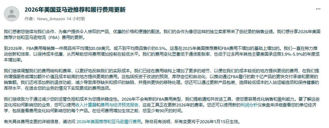 根据公告,平均每件商品的FBA费用将增加0.08美元。平台同步明确,2026年不新增FBA费用类型,并提前至少90天通知,为卖家预留充足准备时间,所有变更将于2026年1月15日正式生效。