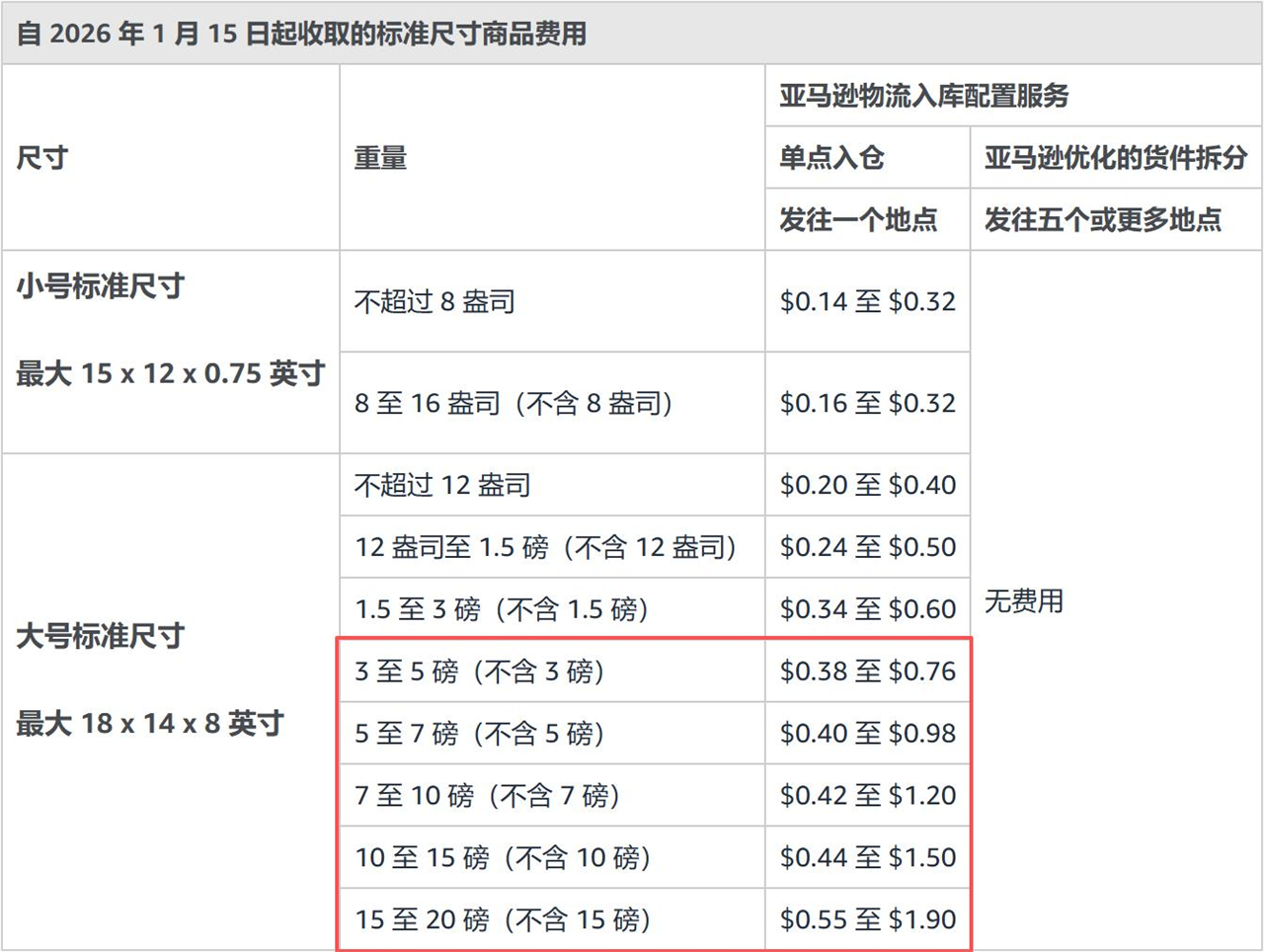 使用最小拆分选项时,标准尺寸商品的入库配置服务费每件将平均增加05美元。此外,亚马逊还将对3~20磅之间的大号标准尺寸商品进行更新,包含五个新的配送重量分段(如下图所示)。