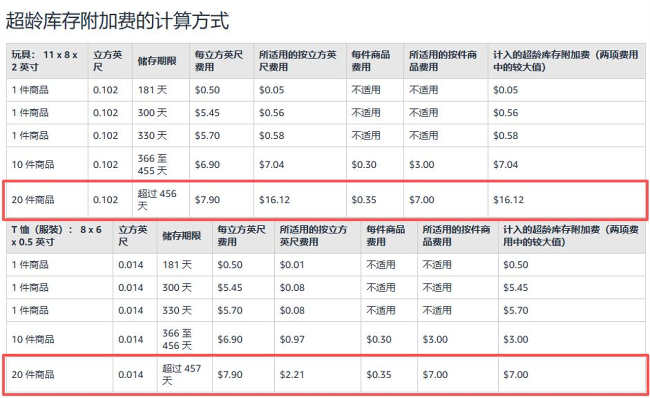 库龄超过15个月的商品,将按每月每件0.35美元或每立方英尺7.90美元收取超龄库存费,按较高者收取。针对库龄超过15个月的商品,亚马逊还将增加新的超龄库存费用分段(如下图所示)。