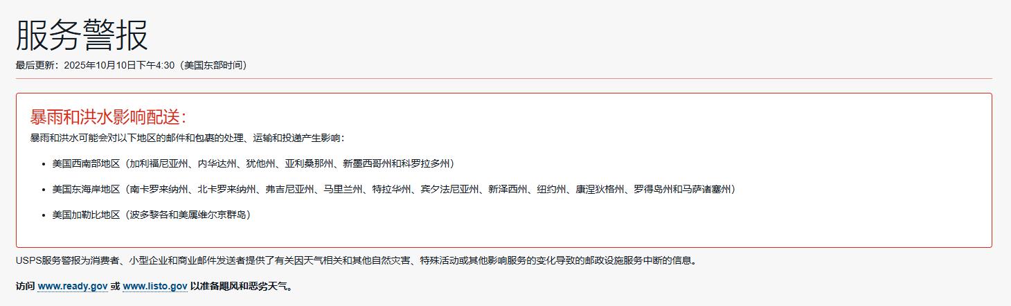 导读:美国邮政(USPS)于2025年10月10日下午4:30(美国东部时间)发布紧急通知,因暴雨和洪水灾害,美国多地的邮件和包裹处理、运输及投递工作将受到严重影响。